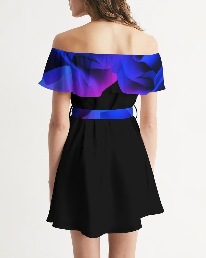 About The ArtBlue&Purple Rose This rose was so enticing with its colors almost looks like it glows Product DetailsWith a beautifully ruffled neckline, you will look effortless in our Women's Off-Shoulder Dress. Sheer chiffon is adorned with smocked detailing, a ruffled hem, and topped off with an adjustable belted waist tie detail.