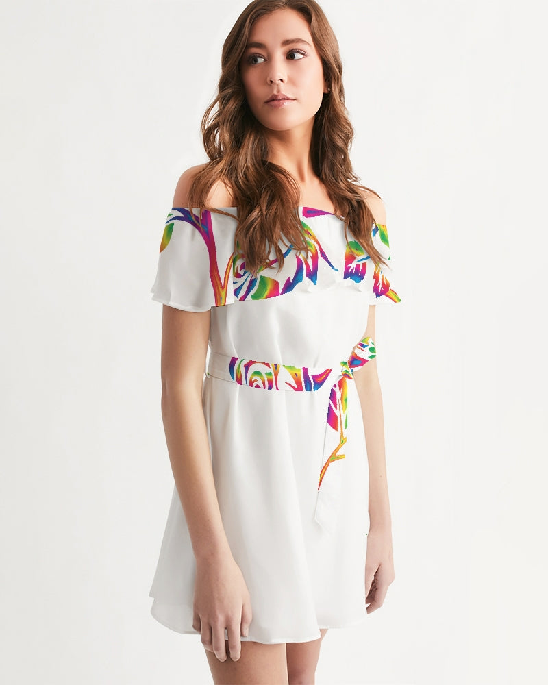 About The ArtLIMITED EDITION* Pride Rose 2021 Celebrate Pride 2021 with Hood Rose Pre-lauch!! This is Hood Rose Pride Exclusive gear for 2021- If Your are seeing these items You are apart of my pre-launch list...You will be 1 of few to be able to own any of these exclusive items! Product DetailsWith a beautifully ruffled neckline, you will look effortless in our Women's Off-Shoulder Dress. Sheer chiffon is adorned with smocked detailing, a ruffled hem, and topped off with an adjustable belted waist tie detail.