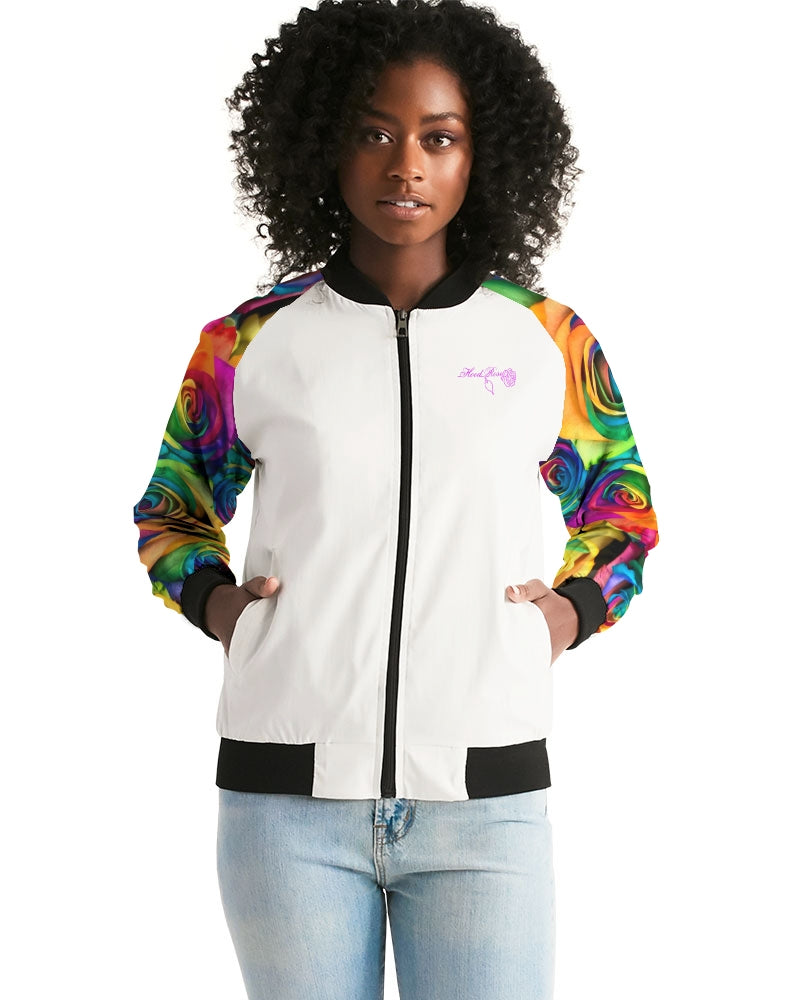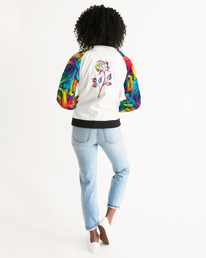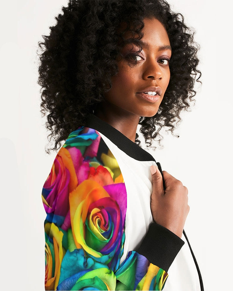 About The ArtSpecial Edition* Tie Dye Pride 2021 Celebrate Pride 2021 with Hood Rose's Special Edition Tie Dye Rainbow Roses Product DetailsHand-cut and crafted with care, your custom designed Women's Bomber Jacket will set off any look! Its lightweight, airy fabric is lined with the perfect amount of insulation for the chillier months making this a great year round go-to.